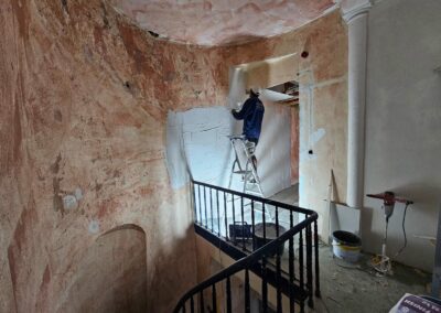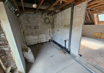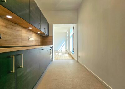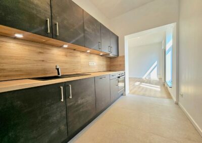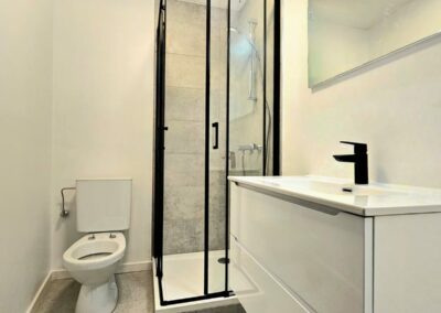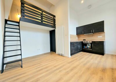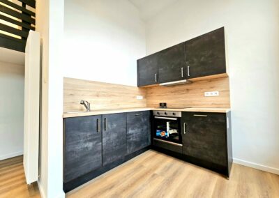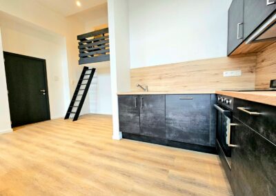 Chaque appartement a été équipé de cuisines modernes de la marque Ego, offrant un design fonctionnel et élégant. Les travaux de plafonnage, la pose de parquet, l’installation de cloisons, et la peinture ont permis de créer des espaces intérieurs à la fois esthétiques et confortables, tout en conservant le charme du bâtiment d’époque.